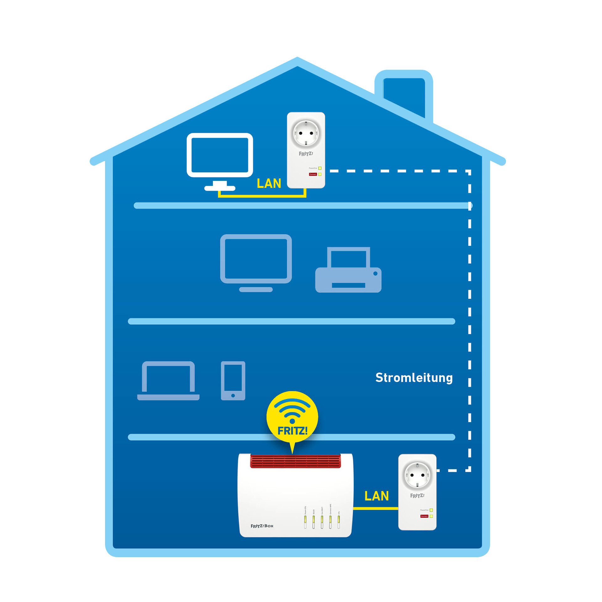Das FRITZ!Powerline 1220 Set verbindet netzwerkfähige Geräte wie Computer, Fernseher oder Spielekonsolen zuverlässig und schnell auch über große Entfernungen im Heimnetz. Je Adapter stehen 2 ultraschnelle Gigabit-LAN-Anschlüsse zur Verfügung. Mit der Vernetzung über die Stromleitung werden lange Distanzen sowie Hindernisse, wie Wände und Decken, spielend gemeistert. Gegenüber Powerline-Adaptern der 500- und 200-MBit/s-Klasse ermöglicht FRITZ!Powerline 1220 deutlich mehr Übertragungskapazität und robustere Verbindungen – bei hoher Energieeffizienz. Mehrere anspruchsvolle Breitband-Anwendungen werden so im Parallelbetrieb nutzbar.