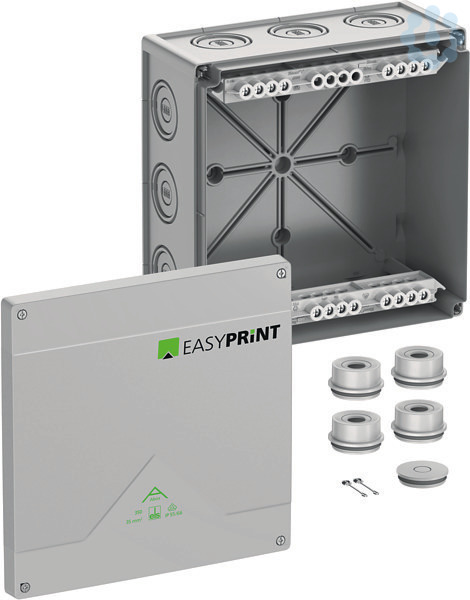 Abzweigkasten, mit individueller Bedruckung, konfigurierbar über spelsberg.de/easyprint, mit Schutzart IP55/IP66, Nennquerschnitt 35mm², zertifiziert durch VDE (DIN EN 60670-1/-22 (VDE 0606-1/-22)), DLG (Ammoniakbeständigkeit), Ausschlagmembranen, M20/M25/M40/M50, (4 rückseitig, 12 seitlich), innenliegende Befestigungsstellen, für Standardinstallationen im Innenbereich und geschütztem Außenbereich, grau, Ui=690 V AC, In=125 A, mit hochliegender Schraubklemme, 5-polig-35mm², klemmbare Querschnitte pro Pol: 12 x 10mm², 8 x 16mm², 4 x 25mm², 4 x 35mm² Cu starr / flexibel mit Aderendhülse
