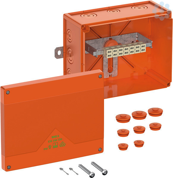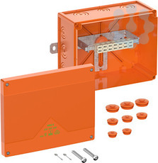 Abzweigkasten, mit Schutzart IP66, Ui=450 V AC, zertifiziert durch VDE (DIN EN 60670-1/-22 (VDE 0606-1/-22)), UL-EU (EN 62208), Ausschlagmembranen, M20/M25/M32/M40, (4 rückseitig, 12 seitlich), außenliegende Befestigungsstellen, mit elektrischem Funktionserhalt E30-E90 nach DIN 4102 Teil 12. Halogenfreies Gehäuse aus Spezialthermoplast, Klemmen aus hochtemperaturbeständiger Spezialkeramik, Klemmenhalter frei positionierbar, orange, Verbindungskasten 7-polig 0,5-6mm², Abzweigkasten 7-polig 0,5-6mm², Anzahl der klemmbaren Leiter pro Pol: 16 x 0,5² / 8 x 0,75² / 12 x 1² / 12 x 1,5² / 4 x 2,5² / 4 x 4² / 4 x 6²