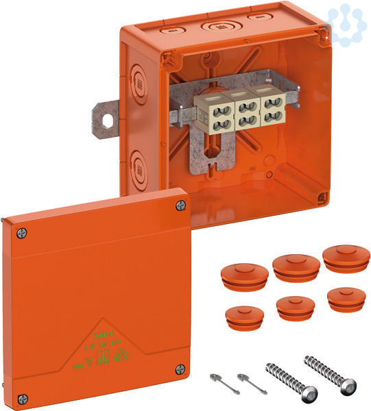 Abzweigkasten, mit Schutzart IP66, Ui=450 V AC, zertifiziert durch VDE (DIN EN 60670-1/-22 (VDE 0606-1/-22)), UL-EU (EN 62208), Ausschlagmembranen, M20/M25/M32, (2 rückseitig, 10 seitlich), außenliegende Befestigungsstellen, mit elektrischem Funktionserhalt E30-E90 nach DIN 4102 Teil 12. Halogenfreies Gehäuse aus Spezialthermoplast, Klemmen aus hochtemperaturbeständiger Spezialkeramik, Klemmenhalter frei positionierbar, orange, Verbindungskasten 3-polig 1 -10mm², Abzweigkasten 3-polig 1-10mm², Anzahl der klemmbaren Leiter pro Pol: 20 x 1² / 16 x 1,5² / 12 x 2,5² / 8 x 4² / 4 x 6² / 4 x 10²