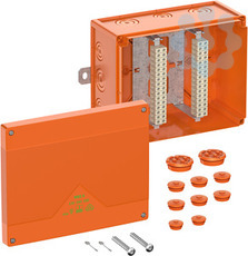 Abzweigkasten, mit Schutzart IP66, Ui=450 V AC, zertifiziert durch VDE (DIN EN 60670-1/-22 (VDE 0606-1/-22)), UL-EU (EN 62208), M20/M25/M32/M40, (4 rückseitig, 12 seitlich), außenliegende Befestigungsstellen, mit elektrischem Funktionserhalt E30-E90 nach DIN 4102 Teil 12. Halogenfreies Gehäuse aus Spezialthermoplast, Klemmen aus hochtemperaturbeständiger Spezialkeramik, Klemmenhalter frei positionierbar, orange, Verbindungskasten 32-polig 0,5-2,5mm², Abzweigkasten 32-polig 0,5-1,5mm², Anzahl der klemmbaren Leiter pro Pol: 8 x 0,5² / 4 x 0,75² / 6 x 1² / 6 x 1,5² / 2 x 2,5²