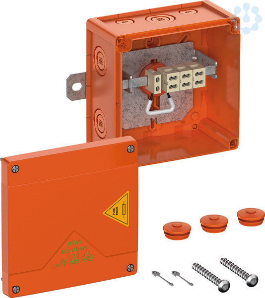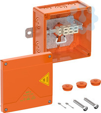 Abzweigkasten, mit Schutzart IP66, Ui=450 V AC, zertifiziert durch UL-EU (EN 62208), UL-EU (EN 61439-1/-2), Ausschlagmembranen, M20/M25/M32, (2 rückseitig, 12 seitlich), außenliegende Befestigungsstellen, mit elektrischem Funktionserhalt E30-E90 nach DIN 4102 Teil 12. Halogenfreies Gehäuse aus Spezialthermoplast, Klemmen aus hochtemperaturbeständiger Spezialkeramik, Klemmenhalter frei positionierbar, orange, Verbindungskasten 3-polig 0,5-6mm², Abzweigkasten 3-polig 0,5-6mm², Sicherung im Abzweig 1 x 2A (innenliegend, 1 x WKE BS F2A, 86300101), Anzahl der klemmbaren Leiter pro Klemmstelle: 4 x 0,5² / 2 x 0,75² / 3 x 1² / 3 x 1,5² / 1 x 2,5² / 1 x 4² / 1 x 6²