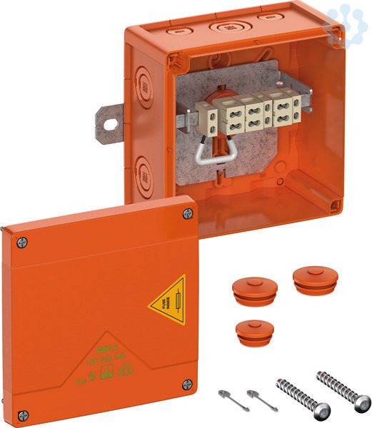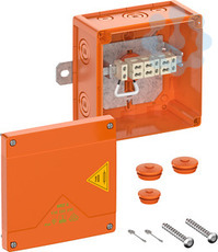 Abzweigkasten, mit Schutzart IP66, Ui=450 V AC, zertifiziert durch UL-EU (EN 62208), UL-EU (EN 61439-1/-2), Ausschlagmembranen, M20/M25/M32, (2 rückseitig, 12 seitlich), außenliegende Befestigungsstellen, mit elektrischem Funktionserhalt E30-E90 nach DIN 4102 Teil 12. Halogenfreies Gehäuse aus Spezialthermoplast, Klemmen aus hochtemperaturbeständiger Spezialkeramik, Klemmenhalter frei positionierbar, orange, Verbindungskasten 5-polig 0,5-6mm², Abzweigkasten 3-polig 0,5-6mm², Sicherung im Abzweig 1 x 2A (innenliegend, 1 x WKE BS F2A, 86300101), Anzahl der klemmbaren Leiter pro Klemmstelle: 4 x 0,5² / 2 x 0,75² / 3 x 1² / 3 x 1,5² / 1 x 2,5² / 1 x 4² / 1 x 6²