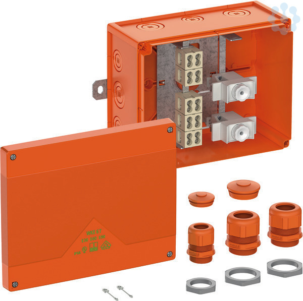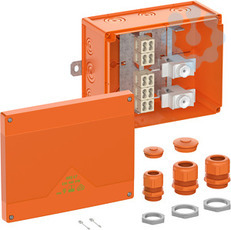 Abzweigkasten, mit Schutzart IP66, Ui=450 V AC, zertifiziert durch UL-EU (EN 62208), UL-EU (EN 61439-1/-2), Ausschlagmembranen, M20/M25/M32/M40, (4 rückseitig, 12 seitlich), außenliegende Befestigungsstellen, mit elektrischem Funktionserhalt E30-E90 nach DIN 4102 Teil 12. Druck-Sog-Dicht gemäß Gotthard-Richtlinie. Halogenfreies Gehäuse aus Spezialthermoplast, Klemmen aus hochtemperaturbeständiger Spezialkeramik, Klemmenhalter frei positionierbar, Schnellmontage durch Außenbefestigungslaschen aus Edelstahl 1.4571. Deckelschrauben aus Edelstahl 1.4578, orange, Verbindungskasten 5-polig 1,5-16mm², Abzweigkasten 3-polig 1,5-10mm², Sicherung im Abzweig 2 x Sockel D01 (ohne Einsatz), Anzahl der klemmbaren Leiter pro Klemmstelle 5 x 1,5² / 4 x 2,5² / 2 x 4² / 2 x 6² / 1 x 10² / 1 x 16²