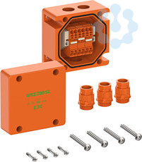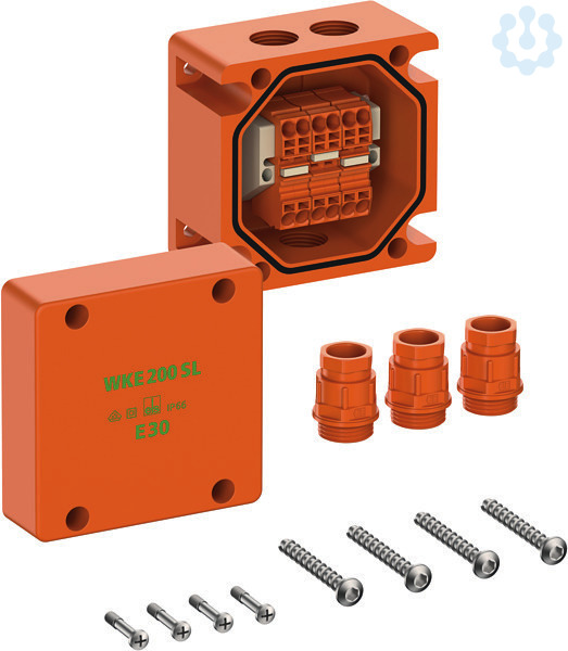 Abzweigkasten, mit Schutzart IP66, Ui=450 V AC, zertifiziert durch VDE (DIN EN 60670-1/-22 (VDE 0606-1/-22)), Innengewinde, M25, (3 seitlich), außenliegende Befestigungsstellen, mit elektrischem Funktionserhalt E30 nach DIN 4102 Teil 12, mit schraubenlosen Reihenklemmen Wago TopJobS, Gehäuse aus halogenfreiem Spezialduroplast, orange, Abzweigkasten 3-polig, Klemmvermögen pro Pol 4 x 0,5-4mm²