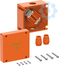 Abzweigkasten, mit Schutzart IP66, Ui=450 V AC, zertifiziert durch VDE (DIN EN 60670-1/-22 (VDE 0606-1/-22)), Innengewinde, M32, (2 seitlich), außenliegende Befestigungsstellen, mit elektrischem Funktionserhalt E30 nach DIN 4102 Teil 12, mit schraubenlosen Reihenklemmen Wago TopJobS, Gehäuse aus halogenfreiem Spezialduroplast, orange, Verbindungskasten 5-polig, Klemmvermögen pro Pol 2 x 0,5-10mm²