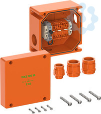 Abzweigkasten, mit Schutzart IP66, Ui=450 V AC, Innengewinde, M25/M32, (3 seitlich), außenliegende Befestigungsstellen, mit elektrischem Funktionserhalt E30 nach DIN 4102 Teil 12, geprüft nach VDE (DIN EN 61439-1/-2 (VDE 0660-600-1/-2)), mit schraubenlosen Reihenklemmen Wago TopJobS, Gehäuse aus halogenfreiem Spezialduroplast, orange, Abzweigkasten mit abgesichertem Abzweig, Verbindungskasten 5-polig, Anzahl klemmbarer Leiter pro Pol 4 x 0,5-10mm², Abzweigkasten 3-polig, Klemmvermögen 4 x 0,5-6mm², 1 Sicherungshalter (20 x 5mm) max. 10 A
