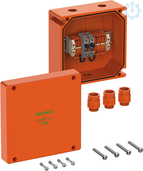 Abzweigkasten, mit Schutzart IP66, Ui=450 V AC, Innengewinde, M25, (3 seitlich), außenliegende Befestigungsstellen, mit elektrischem Funktionserhalt E30 nach DIN 4102 Teil 12, geprüft nach VDE (DIN EN 61439-1/-2 (VDE 0660-600-1/-2)), mit schraubenlosen Reihenklemmen Wago TopJobS, Gehäuse aus halogenfreiem Spezialduroplast, orange, Abzweigkasten mit abgesichertem Abzweig, Verbindungskasten 3-polig, Abzweigkasten 3-polig, Anzahl klemmbarer Leiter pro Pol 4 x 0,5-6mm², Klemmvermögen pro Klemmstelle 1 x 0,5-6mm², 2 Sicherungshalter (20 x 5mm) max. 10 A
