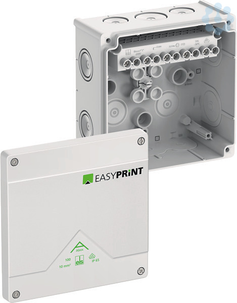 Abzweigkasten, mit individueller Bedruckung, konfigurierbar über spelsberg.de/easyprint, mit Schutzart IP66, Nennquerschnitt 10mm², zertifiziert durch VDE (DIN EN 60670-1/-22 (VDE 0606-1/-22)), DLG (Ammoniakbeständigkeit), selbstdichtende, weiche Einführungsmembranen, M20/M25/M32, Dichtbereich 8-28mm, (2 rückseitig, 10 seitlich), innenliegende Befestigungsstellen, für Standardinstallationen im Innenbereich und geschütztem Außenbereich, weiß, Ui=690 V AC, In=57 A, mit hochliegender Schraubklemme, 5-polig-10², klemmbare Querschnitte pro Pol: 4 x 2,5mm², 4 x 4mm², 4 x 6mm², 4 x 10mm² Cu starr / flexibel mit Aderendhülse
