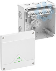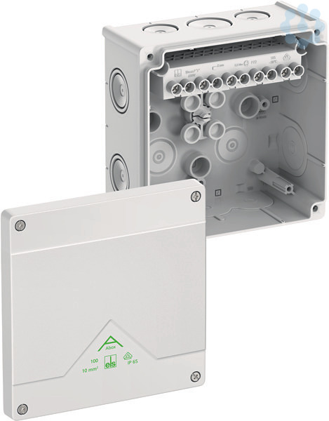 Abzweigkasten, mit Schutzart IP66, Nennquerschnitt 10mm², zertifiziert durch VDE (DIN EN 60670-1/-22 (VDE 0606-1/-22)), DLG (Ammoniakbeständigkeit), selbstdichtende, weiche Einführungsmembranen, M20/M25/M32, Dichtbereich 8-28mm, (2 rückseitig, 10 seitlich), innenliegende Befestigungsstellen, für Standardinstallationen im Innenbereich und geschütztem Außenbereich, weiß, Ui=690 V AC, In=57 A, mit hochliegender Schraubklemme, 5-polig, max. Nennquerschnitt nach DIN EN 60998: 10mm², klemmbare Querschnitte pro Pol: 4 x 2,5mm², 4 x 4mm², 4 x 6mm², 4 x 10mm², 2 x 16mm² Cu starr / flexibel mit Aderendhülse