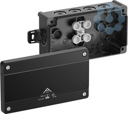 Abzweigkasten, mit Schutzart IP66, Nennquerschnitt 2,5mm², zertifiziert durch VDE (DIN EN 60670-1/-22 (VDE 0606-1/-22)), DLG (Ammoniakbeständigkeit), selbstdichtende, weiche Einführungsmembranen, M20, Dichtbereich 4-16mm, (2 rückseitig, 10 seitlich), außenliegende Befestigungsstellen, für Standardinstallationen im Innenbereich und geschütztem Außenbereich, schwarz, Ui=1000 V AC, ohne Klemmen