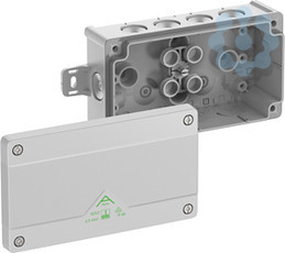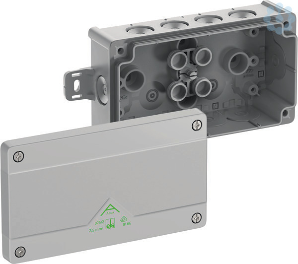 Abzweigkasten, mit Schutzart IP66, Nennquerschnitt 2,5mm², zertifiziert durch VDE (DIN EN 60670-1/-22 (VDE 0606-1/-22)), DLG (Ammoniakbeständigkeit), selbstdichtende, weiche Einführungsmembranen, M20, Dichtbereich 4-16mm, (2 rückseitig, 10 seitlich), außenliegende Befestigungsstellen, für Standardinstallationen im Innenbereich und geschütztem Außenbereich, grau, Ui=1000 V AC, ohne Klemmen