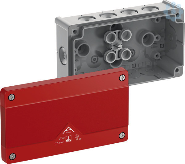 Abzweigkasten, mit Schutzart IP66, Nennquerschnitt 2,5mm², zertifiziert durch VDE (DIN EN 60670-1/-22 (VDE 0606-1/-22)), DLG (Ammoniakbeständigkeit), selbstdichtende, weiche Einführungsmembranen, M20, Dichtbereich 4-16mm, (2 rückseitig, 10 seitlich), innenliegende Befestigungsstellen, für Standardinstallationen im Innenbereich und geschütztem Außenbereich, grau, Ui=1000 V AC, mit rotem Deckel, ohne Klemmen, zur Kennzeichnung von Stromkreisen der Sicherheitsbeleuchtung