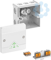 Abzweigkasten, mit Schutzart IP66, Nennquerschnitt 2,5mm², Ui=450 V AC, zertifiziert durch VDE (DIN EN 60670-1/-22 (VDE 0606-1/-22)), DLG (Ammoniakbeständigkeit), selbstdichtende, weiche Einführungsmembranen, M16/M20, Dichtbereich 4-16mm, (1 rückseitig, 8 seitlich), innenliegende Befestigungsstellen, mit schraubenlosen Klemmen und Klemmenhalter, für Standardinstallationen im Innenbereich und geschütztem Außenbereich, weiß, In=24 A, mit 3 bodenfixierten, schraubenlosen 3-Leiter-Klemmen Wago 221-413-2,5mm², klemmbare Querschnitte pro Pol: 3 x 0,2 bis 2,5mm² starr Cu und 3 x 0,14 bis 2,5mm² flexibel Cu