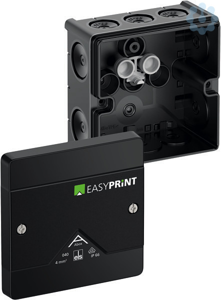 Abzweigkasten, mit individueller Bedruckung, konfigurierbar über spelsberg.de/easyprint, mit Schutzart IP66, Nennquerschnitt 4mm², zertifiziert durch VDE (DIN EN 60670-1/-22 (VDE 0606-1/-22)), DLG (Ammoniakbeständigkeit), selbstdichtende, weiche Einführungsmembranen, M20/M25, Dichtbereich 4-21mm, (1 rückseitig, 10 seitlich), innenliegende Befestigungsstellen, für Standardinstallationen im Innenbereich und geschütztem Außenbereich, schwarz, Ui=1000 V AC, ohne Klemmen