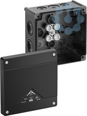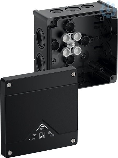 Abzweigkasten, mit Schutzart IP66, Nennquerschnitt 6mm², zertifiziert durch VDE (DIN EN 60670-1/-22 (VDE 0606-1/-22)), DLG (Ammoniakbeständigkeit), selbstdichtende, weiche Einführungsmembranen, M20/M25/M32, Dichtbereich 4-28mm, (2 rückseitig, 8 seitlich), innenliegende Befestigungsstellen, für Standardinstallationen im Innenbereich und geschütztem Außenbereich, schwarz, Ui=1000 V AC, ohne Klemmen