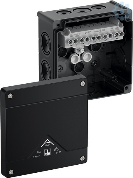 Abzweigkasten, mit Schutzart IP66, Nennquerschnitt 6mm², zertifiziert durch VDE (DIN EN 60670-1/-22 (VDE 0606-1/-22)), DLG (Ammoniakbeständigkeit), selbstdichtende, weiche Einführungsmembranen, M20/M25/M32, Dichtbereich 4-28mm, (2 rückseitig, 8 seitlich), innenliegende Befestigungsstellen, für Standardinstallationen im Innenbereich und geschütztem Außenbereich, schwarz, Ui=690 V AC, In=41 A, mit hochliegender Schraubklemme, 5-polig, max. Nennquerschnitt nach DIN EN 60998: 6mm², klemmbare Querschnitte pro Pol: 4 x 1,5mm², 4 x 2,5mm², 4 x 4mm², 4 x 6mm², 2 x 10mm² Cu starr / flexibel mit Aderendhülse