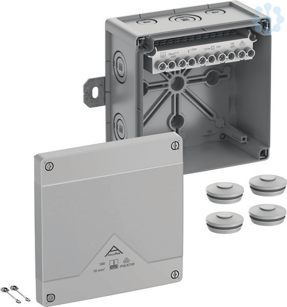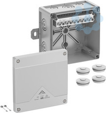 Abzweigkasten, mit Schutzart IP66/IP67/IP69, Nennquerschnitt 10mm², zertifiziert durch VDE (DIN EN 60670-1/-22 (VDE 0606-1/-22)), DLG (Ammoniakbeständigkeit), DNV (Klasse: Schiffe & Offshore-Anlagen), Ausschlagmembranen, M20/M25/M32, (2 rückseitig, 10 seitlich), außenliegende Befestigungsstellen, für Installationen im industriellen Umfeld und ungeschütztem Außenbereich, grau, Ui=690 V AC, In=57 A, grau, Ui=690 V AC, In=57 A, mit hochliegender Schraubklemme,mit hochliegender Schraubklemme, 5-polig, max. Nennquerschnitt nach DIN EN 60998: 10mm², klemmbare Querschnitte pro Pol: 4 x 2,5mm², 4 x 4mm², 4 x 6mm², 4 x 10mm², 2 x 16mm² Cu starr / flexibel mit Aderendhülse