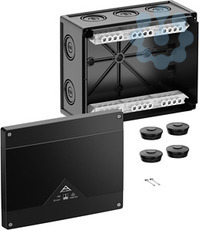 Abzweigkasten, mit Schutzart IP66/IP67/IP69, Nennquerschnitt 25mm², zertifiziert durch VDE (DIN EN 60670-1/-22 (VDE 0606-1/-22)), DLG (Ammoniakbeständigkeit), DNV (Klasse: Schiffe & Offshore-Anlagen), Ausschlagmembranen, M20/M25/M40/M50, (4 rückseitig, 10 seitlich), innenliegende Befestigungsstellen, für Installationen im industriellen Umfeld und ungeschütztem Außenbereich, schwarz, Ui=690 V AC, In=101 A, mit hochliegender Schraubklemme, 5-polig-25mm², klemmbare Querschnitte pro Pol: 12 x 10mm², 8 x 16mm², 4 x 25mm² Cu starr / flexibel mit Aderendhülse