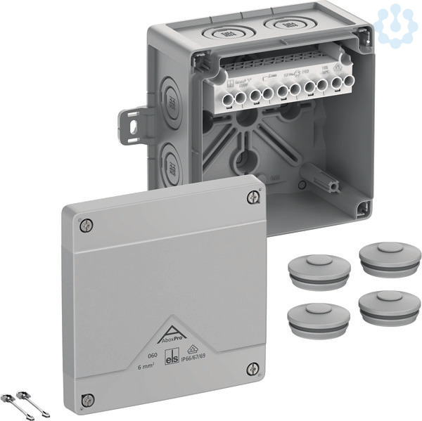 Abzweigkasten, mit Schutzart IP66/IP67/IP69, Nennquerschnitt 6mm², zertifiziert durch VDE (DIN EN 60670-1/-22 (VDE 0606-1/-22)), DLG (Ammoniakbeständigkeit), DNV (Klasse: Schiffe & Offshore-Anlagen), Ausschlagmembranen, M20/M32, (1 rückseitig, 7 seitlich), außenliegende Befestigungsstellen, für Installationen im industriellen Umfeld und ungeschütztem Außenbereich, grau, Ui=690 V AC, In=41 A, mit hochliegender Schraubklemme, 5-polig, max. Nennquerschnitt nach DIN EN 60998: 6mm², klemmbare Querschnitte pro Pol: 4 x 1,5mm², 4 x 2,5mm², 4 x 4mm², 4 x 6mm², 2 x 10mm² Cu starr / flexibel mit Aderendhülse
