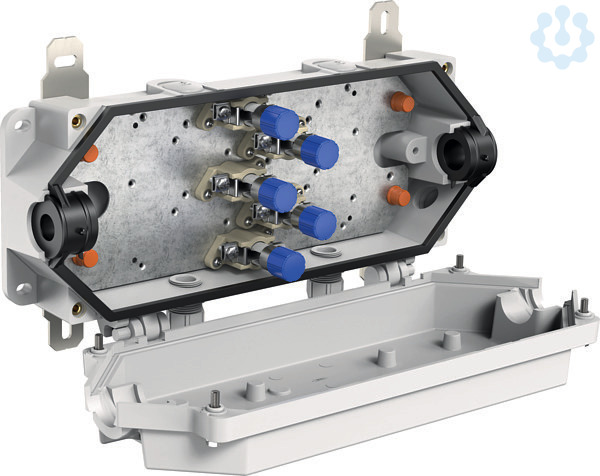 Abzweigkasten, mit Schutzart IP66/IP67, Ui=400 V AC, M25, (5 seitlich), außenliegende Befestigungsstellen, für Installationen im industriellen Umfeld und Tunnelbereich, Druck-Sog-Dicht nach Gotthard-Richtlinie. Halogenfreies Gehäuse aus Spezialduroplast, Klemmen aus hochtemperaturbeständiger Spezialkeramik. Außenbefestigungslaschen und Deckelschrauben aus Edelstahl 1.4571, grau, Durchgang: 5-polige Klemme für ungeschnittene Leiter, Klemmbereich für ungeschnittene Leiter 2,5mm² bis 25mm², Klemmbereich für geschnittene Leiter 2,5mm² bis 16mm², Bemessungsstrom 63A. Abzweig 5-polig 2 x 2,5-6mm², Bemessungsstrom 40A, Dichtbereich Hauptkabel: 17-22mm (andere Dichtbereiche auf Anfrage)