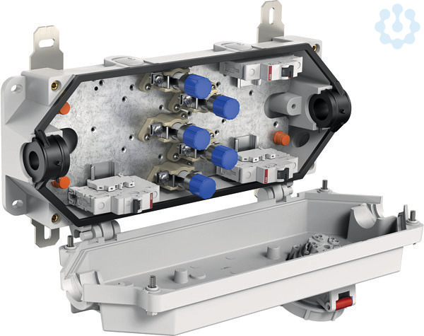 Abzweigkasten, mit Schutzart IP66/IP67, Ui=400 V AC, M25, (5 seitlich), außenliegende Befestigungsstellen, für Installationen im industriellen Umfeld und Tunnelbereich, Druck-Sog-Dicht nach Gotthard-Richtlinie. Halogenfreies Gehäuse aus Spezialduroplast, Klemmen aus hochtemperaturbeständiger Spezialkeramik. Außenbefestigungslaschen und Deckelschrauben aus Edelstahl 1.4571, grau, Durchgang: 5-polige Klemme für ungeschnittene Leiter, Klemmbereich für ungeschnittene Leiter 2,5mm² bis 25mm², Klemmbereich für geschnittene Leiter 2,5mm² bis 16mm², Bemessungsstrom 63A. In Deckel montiert 1 Stück CEE-Steckdose 5-polig 16A, Absicherung durch 3 x Leitungsschutzschalter einpolig B10, vorverdrahtet, Dichtbereich Hauptkabel: 17-22mm (andere Dichtbereiche auf Anfrage)