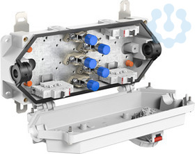 Abzweigkasten, mit Schutzart IP66/IP67, Ui=400 V AC, M25, (5 seitlich), außenliegende Befestigungsstellen, für Installationen im industriellen Umfeld und Tunnelbereich, Druck-Sog-Dicht nach Gotthard-Richtlinie. Halogenfreies Gehäuse aus Spezialduroplast, Klemmen aus hochtemperaturbeständiger Spezialkeramik. Außenbefestigungslaschen und Deckelschrauben aus Edelstahl 1.4571, grau, Durchgang: 5-polige Klemme für ungeschnittene Leiter, Klemmbereich für ungeschnittene Leiter 16mm² bis 50mm², Klemmbereich für geschnittene Leiter 16mm² bis 35mm², Bemessungsstrom 100A. In Deckel montiert 1 Stück CEE-Steckdose 5-polig 16A, Absicherung durch 3 x Leitungsschutzschalter einpolig B10, vorverdrahtet. Dichtbereich Hauptkabel: 21-26mm (andere Dichtbereiche auf Anfrage)
