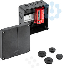 Abzweigkasten, mit Schutzart IP65, Nennquerschnitt 6mm², Ui=450 V AC, Ausschlagmembranen, M20/M25/M32, (2 rückseitig, 10 seitlich), innenliegende Befestigungsstellen, für Installationen im industriellen Umfeld und geschütztem Außenbereich, schwarz, bestückt mit Überspannungsschutz Typ 2 + 3 für TT- und TN-S-Systeme zur Erweiterung eines bestehenden Überspannungsschutzkonzeptes