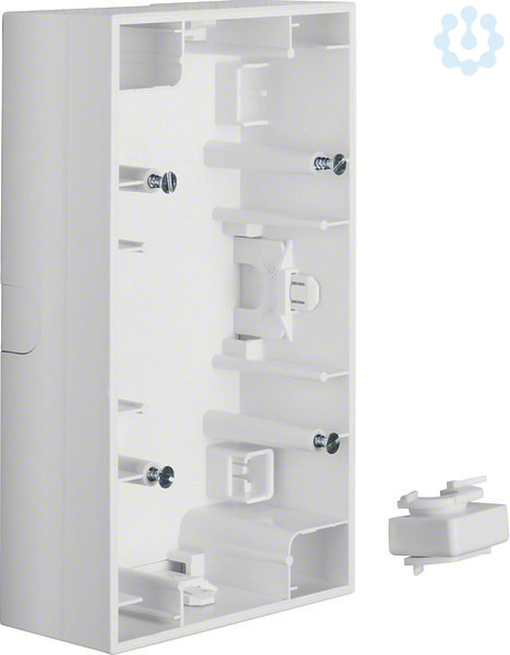 Aufputz-Gehäuse 2fach K.1 polarweiß, glänzend.Aufputz-Gehäuse für senkrechte Montage. Mit Leitungs-/Kanaleinführung oben/unten, Boden geschlossen, zur Aufputz-Installation, zur Montage auf entflammbarem Untergrund geeignet. Material: Kunststoff, halogenfrei.