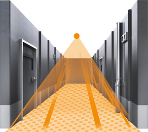 Wegweisende Sensorik. Zielgerichtete Erfassung. Gänge und lange Flure haben spezielle Anforderungen an die Leistung von Sensoren. Schmal aber lang muss das Erfassungsfeld des Sensors sein. Nur so lassen sich mit möglichst wenigen Sensoren, lange Abschnitte zielgerichtet abdecken. Der IS 345 ist der vielfach bewährte Spezialist für solche Anwendungen in Innenbereichen. Er verfügt über eine spezielle Gang- Erfassung und einen Öffnungswinkel von 45°. Damit überwacht er bis 23 x 6 Meter tangential.