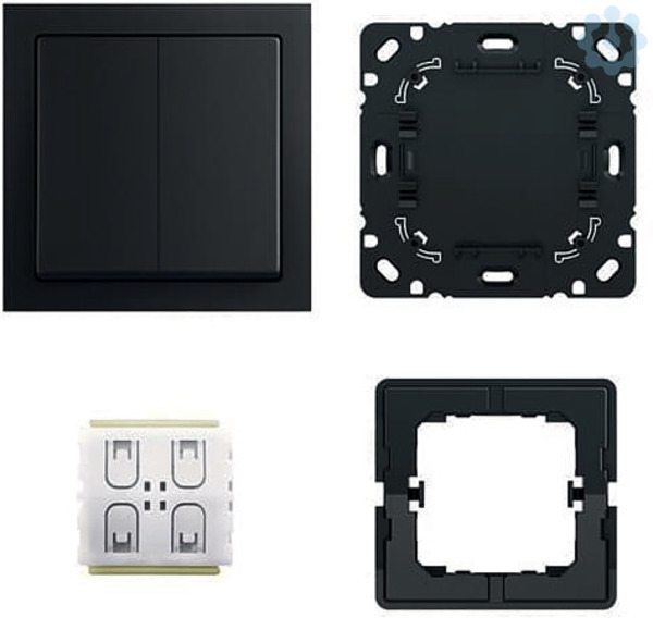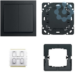 Bestehend aus BLE-Smart-Switch-Einsatz 6716/01 UBT bzw. 6716 UBT, 2fach-Wippe 6736 FoH-xxx für Smart-Switches, Abdeckrahmen 1-fach im entsprechenden Schalterdesign, Befestigungsplatte und Zwischenring.