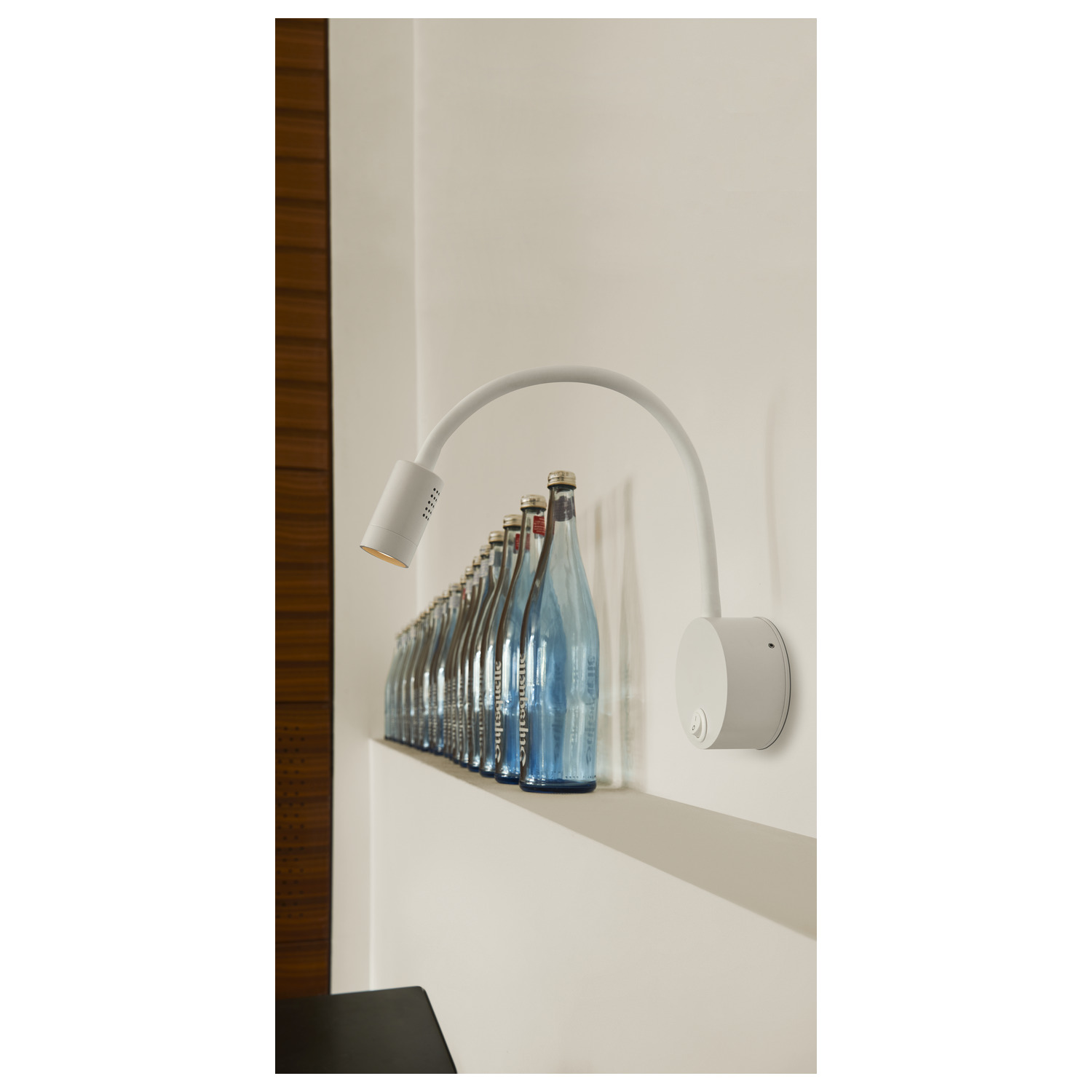 Hochvolt-Displayleuchte für Wandmontage der DIO FLEX PLATE Serie bei der Rosette und Kopf über einen Flexarm verbunden sind. Durch den montierten Schalter ist die individuell ausrichtbare Leuchte für viele Anwendungen geeignet. Der elektrische Anschluss der Leuchte erfolgt direkt an 230V Netzspannung. Als Alternative ist eine LED Version verfügbar.