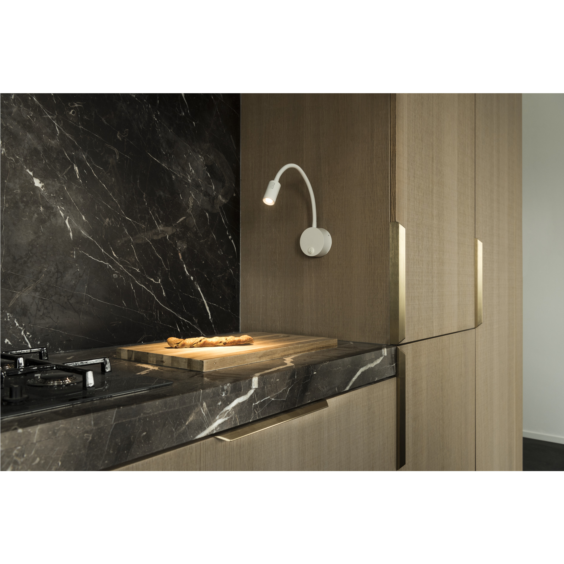 Hochvolt-Displayleuchte für Wandmontage der DIO FLEX PLATE Serie bei der Rosette und Kopf über einen Flexarm verbunden sind. Durch den montierten Schalter ist die individuell ausrichtbare Leuchte für viele Anwendungen geeignet. Der elektrische Anschluss der Leuchte erfolgt direkt an 230V Netzspannung. Als Alternative ist eine LED Version verfügbar.