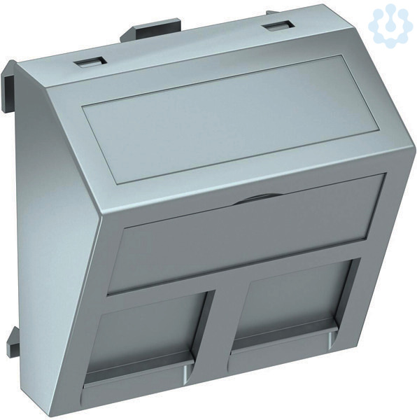 Datentechnikträger mit schrägem Auslass und Verschlussschieber zur Aufnahme von zwei Datentechnik-Anschlussmodulen mit RJ45-Buchse. Die Rastbefestigung eignet sich für den waagerechten und senkrechten Einbau in die Systemumgebung. Typ A hat eine Montageöffnung von 20,10 x 14,80 mm und ist für die direkte Befestigung der Daten-Anschlussmodule in der Montageöffnung ausgelegt.