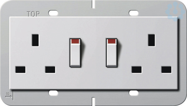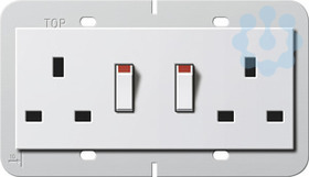 Doppelsteckdose British Standard (BS 1363-2) 13 A 250 V~ geschaltet, mit Shutter Reinweiß glänzend Tragring 80 x 132 mm - Mit Schraubklemmen. - Nur für Schraubbefestigung.