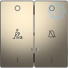 Wippe mit Aufdruck Klingel durchgestrichen/Symbol Reinigungsservice. Zu komplettieren mit Schalter und Taster, 2-fach. Material Metall. Farbe Nickelmetallic.
