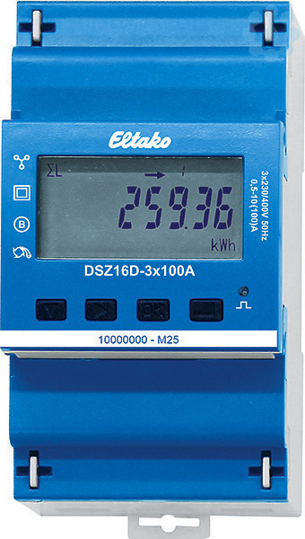 Maximalstrom 3x100 A, Stand-by-Verlust nur 0,8 Watt je Pfad. Reiheneinbaugerät für Montage auf Tragschiene DIN-EN 60715 TH35. 3 Teilungseinheiten = 54mm breit, 58mm tief. Genauigkeitsklasse B (1%). Mit Modbus- und S0-Schnittstelle. Der Eigenverbrauch von nur maximal 0,5 Watt Wirkleistung je Pfad wird nicht gemessen und nicht angezeigt. Es können 1, 2 oder 3 Außenleiter mit Strömen bis zu 100A angeschlossen werden. Der Anlaufstrom beträgt 4OmA je Pfad. Der N-Anschluss muss vorhanden sein. Das 7-Segment LC-Display kann auch ohne Stromversorgung zweimal innerhalb von zwei Wochen abgelesen werden. Der Leistungsbezug wird mit einem 100-mal je kWh blinkenden Balken im Display angezeigt. Anzeige des aktuellen Tarifs (T1–T4). Zunächst schaltet sich die Hintergrundbeleuchtung ein. Danach können die Gesamt-Wirkenergie je Tarif, die Wirkenergie des rücksetzbaren Speichers RS1 bzw. RS2 sowie die Momentanwerte Leistung, Spannung und Strom je Außenleiter angezeigt werden. Fehlermeldung (false): Bei fehlendem Außenleiter oder falscher Stromrichtung wird false und der entsprechende Außenleiter im Display angezeigt.