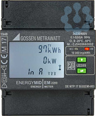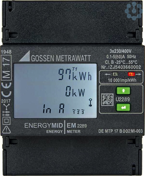 ENERGYMID EM2289 - Multifunktionaler Energiezähler für 4 Leiter-Netze, 400V mit Direktanschluss 5(80) A. Die ENERGYMID EM Energiezähler bieten maximale Funktionalität zum kleinen Preis. Dank einer Vielzahl an Schnittstellen können die Zähler einfach in bestehende Systeme eingebunden werden.. Die neue ENERGYMID Energiezähler-Generation eröffnet Ihnen vollkommen neue Kosteneinsparungspotenziale. Die extrem kleine Bauform mit integrierter Schnittstelle verschafft Ihnen mehr Platz im Verteiler oder Schaltschrank für andere benötigte Funktionen. Dank einer breiten Palette an Schnittstellen sind die geeichten ENERGYMID Energiezähler Ihre perfekte Lösung für die Energieerfassung in Industrie, Haushalt, Gewerbe und Gebäudetechnik – und das zum kleinen Preis.. Multifunktionaler Energiezähler für 4 Leiter-Netz, 400 V mit Direktanschluss 5(80) A ultrakompakte Bauform 4 TE (72 mm) mit integrierter Schnittstelle 4 Quadrantenmessung: Energiebezug und -abgabe Kommunikation via M-Bus, LON, Modbus TCP / BACnet, Modbus RTU, Impulsausgang Erfassung von THD für Strom und Spannung sowie Neutralleiterstrom IN bis zu 8 Tarife . PLATZSPARENDER Integrierte Schnittstelle für die Anbindung an Erfassungs- und Optimierungssysteme Integriertes beleuchtetes Display zum Ablesen von Parametern und Einstellungen Manipulationsschutz mit plombierbarer Abdeckung und Parametriersperre SCHNELLER INSTALLIERT Schnellere Installation durch Fehlererkennung mit Farbwechsel am Display Einfache Fehlererkennung durch Überwachung der Installationsparameter wie beispielsweise Drehfeldrichtung KOSTENEFFEKTIVER Sofort für Abrechnungszwecke geeignet durch Ersteichung nach MID ab Werk Keine zusätzlichen Kosten durch externe Stromwandler In Deutschland nach strengsten Quallitätskriterien gefertigt 3 Jahre GarantieINTEGRIERBAR Vielseitige Anbindung Modbus TCP. Der geeichte Energiezähler kann zur Erfassung und Abrechnung der Wirkenergie in Industrie, Haushalt, Gewerbe und Gebäudetechnik eingesetzt werden. Die Übertragung der Werte an Erfassungs-, Abrechnungs- und Optimierungssysteme sowie Gebäudeautomation und Leittechnik erfolgt über Impulsausgang oder Busschnittstellen. Energieerfassung in der Industrie für einzelne Linien oder Maschinen Messung erneuerbarer Energien aus Photovoltaik- und Windenergieanlagen Erfassung und Verrechnung des Verbrauchs bei Campingplätzen,Einkaufszentren, Wohnanlagen, Bootsanlegern Energieerfassung für Hotels, Kongresszentren und Messen Interne Kostenverteilung für Timesharing-Wohnungen und untervermietete Industriegebäude Verbrauchsabrechnung in Business-Centern Aufbau von Energieerfassungssystemen Fernübertragung von Verbrauchswerten und Kostenabrechnung. 36 Monate Garantie auf Material- und Fabrikationsfehler. ENERGYMID Energiezähler Kurzbedienungsanleitung