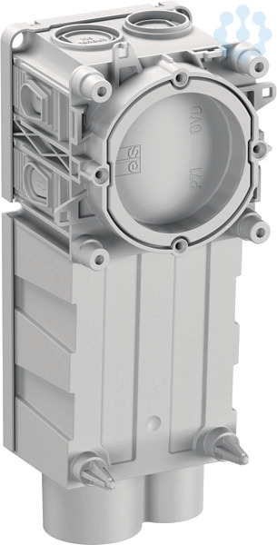 Geräte-Verbindungsdose, speziell für die liegende Werksfertigung, 1-teilig, Durchmesser 60mm Ø, 4 Schraubdome mit Schraubabstand 60mm, kombinierbar, geeignet auch für Gegenschalung, kombinierbar im Normabstand 71mm, mit Schutzart IP30, Bemessungsisolationsspannung: 400V AC, zertifiziert durch VDE (DIN EN 60670-1/-22 (VDE 0606-1/-22)), halogenfrei, mit zusätzlich erweitertem Anschlussraum für Installation von RuK- und IuK-Komponenten gemäß Empfehlung der DIN 18015-1, so wie zur Aufnahme von Aktoren/Sensoren/Devices im Bereich Smart Home/IoT, kombinierbar auch mit der P71 GVD Type, zusätzlich Krallenbefestigung möglich, feste Rohreinführungen für je ein M25 und M32 Rohr, 4 weitere Einführungen mittels optionaler Rohradapter RA von M16 bis M25, für Spelsberg HM-UNI (97929901), Magnetbefestigung, Integrierte Rohradapter und zusätzliche Rohradapter mit Easy-Cut-Membran, Dichtbereich M16-M32, stützholmfähig