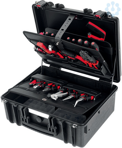 Werkzeugkoffer Gigant-S "Basis" (-Artikelnr. 17 0092), ein Staub- und wasserdichter Werkzeugkoffer nach IP 67, stapelbar, bruch und stoßfest. Der Koffer ist beständig gegen Säure und für Temperaturen von -33°C/+90°C, ebenso schützt ein im Deckel umlaufender O-Dichtring den Inhalt. Bestückt mit einem Dokumentenfach, einem ergonomischen 2-Komponenten-Griff und Klappverschlüssen für ein optionales Vorhängeschloss. Manuelles Druckausgleichventil. Gewicht Koffer leer: 6.500 g, B/T/H: 475/415/215 mm, Innenmaß L/B/H1/H2/H#: 445/345/130/60/190 mm, Koffer bestückt: 9.650 g. Werkzeugbestückung je 1x: 1000 V Telefonzange mit geraden Backen 200 mm, DIN ISO 5745 1 10 0216, 1000 V Telefonzange mit gebogenen Backen 200 mm, DIN ISO 5745 (10 0238), 1000 V Seitenschneider 160 mm, DIN ISO 5749 B (10 0574), JOKARI Automatische Abisolierzange SUPER 4 PRO (10 0784)Elektronik-Seitenschneider bis 1,3 mm ø, 21°, 132 mm (10 1040), Wasserpumpenzange DIN ISO 8976 mit Griffhüllen, 250 mm (10 1224), Presszangensystem click ‘n‘ crimp, Elektrotechnik (10 6000), Kugelkopf-Sechskant-Stiftschlüssel-Satz 7-teilig SW 2,5 - 10, Handklapphalter (11 0596), Phasenprüfer 120 - 250 V AC, 3,0/65 mm (11 1280)Präzisions-Schlitz-Schraubendreher, Farbcode weiß, 2,0x0,4x60 mm (11 1864), 1000 V Schlitz-Schraubendreher SLIM, 3,0x0,5x100 mm, 185 mm (11 7760), 1000 V Schlitz-Schraubendreher SLIM, 4,0x0,8x100 mm, 185 mm (11 7764), 1000 V Schlitz-Schraubendreher SLIM, 5,5x 1,0x125 mm, 220 mm (11 7768), 1000 V Kreuzschlitz-Schraubendreher Phillips SLIM, PH 1x80 mm, 165 mm (11 7777), 1000 V Kreuzschlitz-Schraubendreher Phillips SLIM, PH 2x100 mm, 195 mm (11 7779),1000 V Kreuzschlitz-Schraubendreher Pozidriv SLIM, PZ 1x80 mm, 165 mm (11 7776), 1000 V Kreuzschlitz-Schraubendreher Pozidriv SLIM, PZ 2x100 mm, 195 mm (11 7778), Kabelschere DUOCUT 160 mm, mit zweistufigem Schneidenbereich (12 0108), Taschensäge PROFI, Spannweite 150 mm (12 0490), 1000 V Sicherheits-Kabelmesser, gerade, starke Klinge, 50 mm (12 1042), JOKARI Kabelmesser, 8 - 28 mm ø (12 2016)