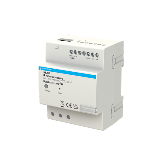 Anschluss einerseits an das Busch-Welcome® IP Netzwerk und anderseits via RS485 an das Relaismodul für Aufzugssteuerung (Art.Nr. M2307-03).