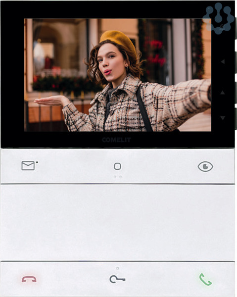 Innenstation Video Logos handsfree (HF) SB2. Weiss zur Aufputzmontage mit 5"-Farbbildschirm 16/9, hörerlos inkl. Memo-Funktion. Regelung der Helligkeit, der Farbe und der Lautstärke des Klingeltons, der individuell unter verschiedenen Melodien ausgewählt werden kann. Serienmäßige Ausstattung mit Tasten für Türöffner, mit entsprechender LED-Anzeige, sowie mit 5 weiteren Tasten für Gesprächsannahme, beenden des Gesprächs, Selbsteinschaltung, Ruf an Pförtnerzentrale und frei programmierbare Taste. Verwaltet serienmäßig den Etagenruf. Serienmäßig mit 1Stk. 8-teiligen DIP-Schaltereinheiten für die Adressierung der Teilnehmeradressen. Die Programmierung der Tasten um weitere Funktionen wie Internruf, schalten eines Relais etc. wird via MyComelit App und NFC Lesemodul vorgenommen. Der Monitor kann nur im System SB2 verwendet werden. Zur Ausstattung gehören die Grundplatte zur Wandmontage oder zur Befestigung auf Gehäusen für den Wohnbereich und die Abzweigklemme zur Steigleitung Art. 1214/2C. Abmessungen: 135x170x23mm.