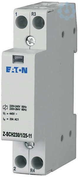 Installationsschütz, Steuerspannung 230V AC, Bemessungsbetriebsstrom AC1 25A, Funktion: 1 x Schließer und 1 x Öffner, Einfache Schnappbefestigung auf 35mm Hutschiene, 1TE, Normen IEC/EN 60947-4-1, IEC/EN 61095 und VDE 0660-5-1