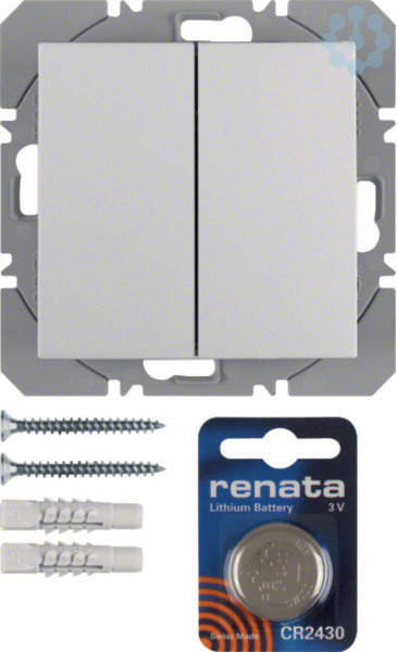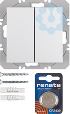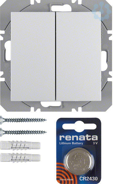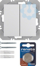KNX-Funk Wandsender 2fach flach quicklink S.1/B.3/B.7 polarweiß, glänzend.KNX-Funk Wandsender 2fach flach quicklink für die Funk Fernbedienung zugeordneter KNX-Funk Empfänger. Flache Aufputz-Montage und Kombinationserweiterung mit einer Lithium Knopf-Batterie 3 V Typ CR 2430. Integration via KNX-Funk Medienkoppler AP ins KNX-TP-System. Werkzeuglose quicklink-Konfiguration über Tasten und LED-Anzeige, obere und untere Bedienfläche frei konfigurierbar, Bedienflächen als Ein- oder Zweiflächenbedienung konfigurierbar, mit Sendestatus- und Batteriestatus-LED rot/grün/orange, mit Konfigurations-LED, Resetfunktion (auf Werkseinstellung).