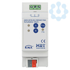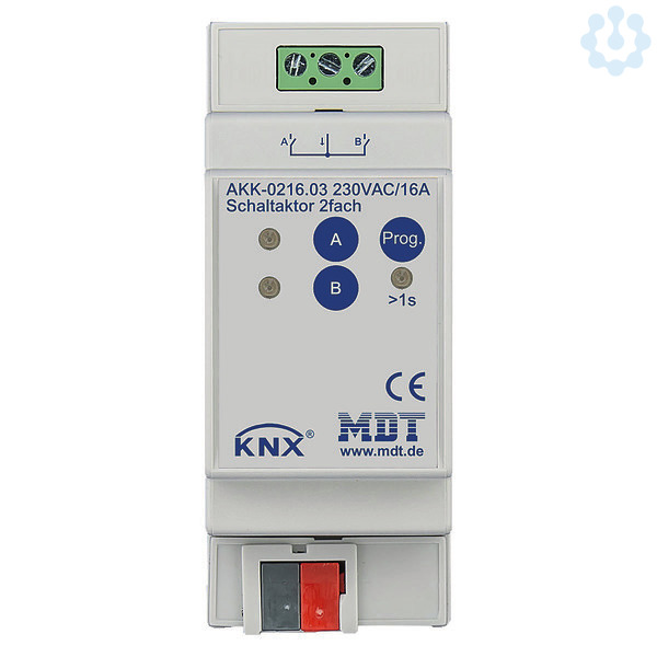 KNX Schaltaktor 2-fach, 2TE REG, 16 A, 230 V AC, Kompakt, 70 µF, 10 EVG. Kompakte Ausführung mit bistabilen Relais. Strom max. 16 A bei ohmscher Last, 70 µF / 10 EVG. Funktionserweiterung. Taster für Handbetrieb und LED Anzeige je Kanal. Schließer- und Öffnerbetrieb. Status Rückmeldung für alle Kanäle (auch bei manueller Betätigung). Zeitfunktionen (Ein-/Ausschaltverzögerung). Umfangreiche Treppenlicht- und Impulsfunktion. Logische Verknüpfungen. Erweiterte Szenenfunktion je Kanal. Zentralfunktionen und Sperrobjekte zur Zwangsführung. Einstellbares Verhalten bei Busspannungsausfall/-wiederkehr. Gemeinsamer L- Anschluß. Versorgungsspannung über KNX-Bus. Schneller Download der Applikation (long frame support ab ETS 5). 3 Jahre Produktgarantie.