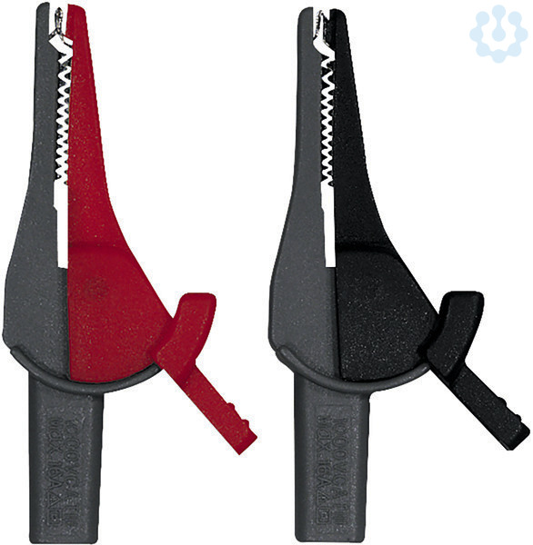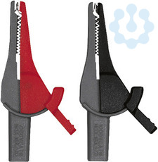 Krokodilklemmen-Sicherheits-Set, rot und schwarz. Öffnungsweite ca. 21 mm, CATIII/1000 V, CAT IV/600 V. Strombelastbarkeit bis 16A. Mit 4 mm-Sicherheitsstecktechnik gemäß DIN VDE 0411/ EN 61010.