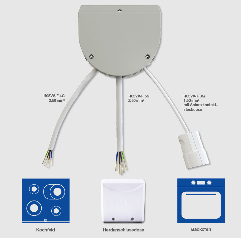 Küchen Anschlussbox 2,0m H05VV-F 5G2,5mm² für Herdanschlussdose 2,0m H05VV-F 4G2,5mm² für Kochfeld 2,0m H05VV-F 3G1,5mm² mit Schukodose für Backofen montierbar, wiederanschließbar mit WAGO-Klemmen Maße: LxB 116,14mm x 125mm, Geringe Einbautiefe: 34mm. Verpackt im Polybeutel.