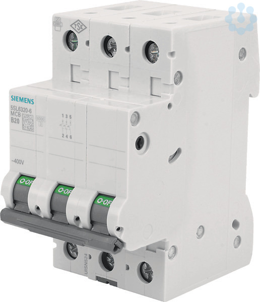 Leitungsschutzschalter 400V 6kA, 3-polig, B, 20A Leitungsschutzschalter SENTRON 5SL für den sicheren Kurzschluss- und Überlastschutz für Standardanwendungen im Wohn- und Zweckbau.Werkzeuglose Montage und Demontage des Geräts. Einfache Verdrahtung der Einspeisung durch die hinten liegende Sammelschiene.Die Leitungsschutzschalter 5SL sind erhältlich in 1-, 2-, 3-, 4- sowie in 1+N- und 3+N-poliger Ausführung sowie in weiteren Sondertypen.Das umfangreiche Zubehör, wie z.B. Hilfsschalter, ermöglicht die vielfältige Erweiterung der Funktionen.Einfach sicher mit den Schutzgeräten von SENTRON.