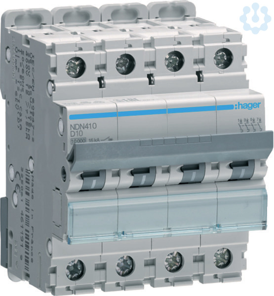 Leitungsschutzschalter 4 polig 10kA/15kA D-10A 4M.Leitungsschutzschalter nach DIN EN 60898-1 (VDE 0641-11) mit zeitverzögertem thermischen Auslöser für Überlastschutz und elektromagnetischer Auslöser für Kurzschlussschutz. Geeignet zum nachträglichen Anbau von Zusatzeinrichtungen. Beschriftungsmöglichkeit direkt am Gerät und Einzelentnahme aus dem Phasenschienenverbund durch Entriegelung der Hutschienenschnellbefestigung.