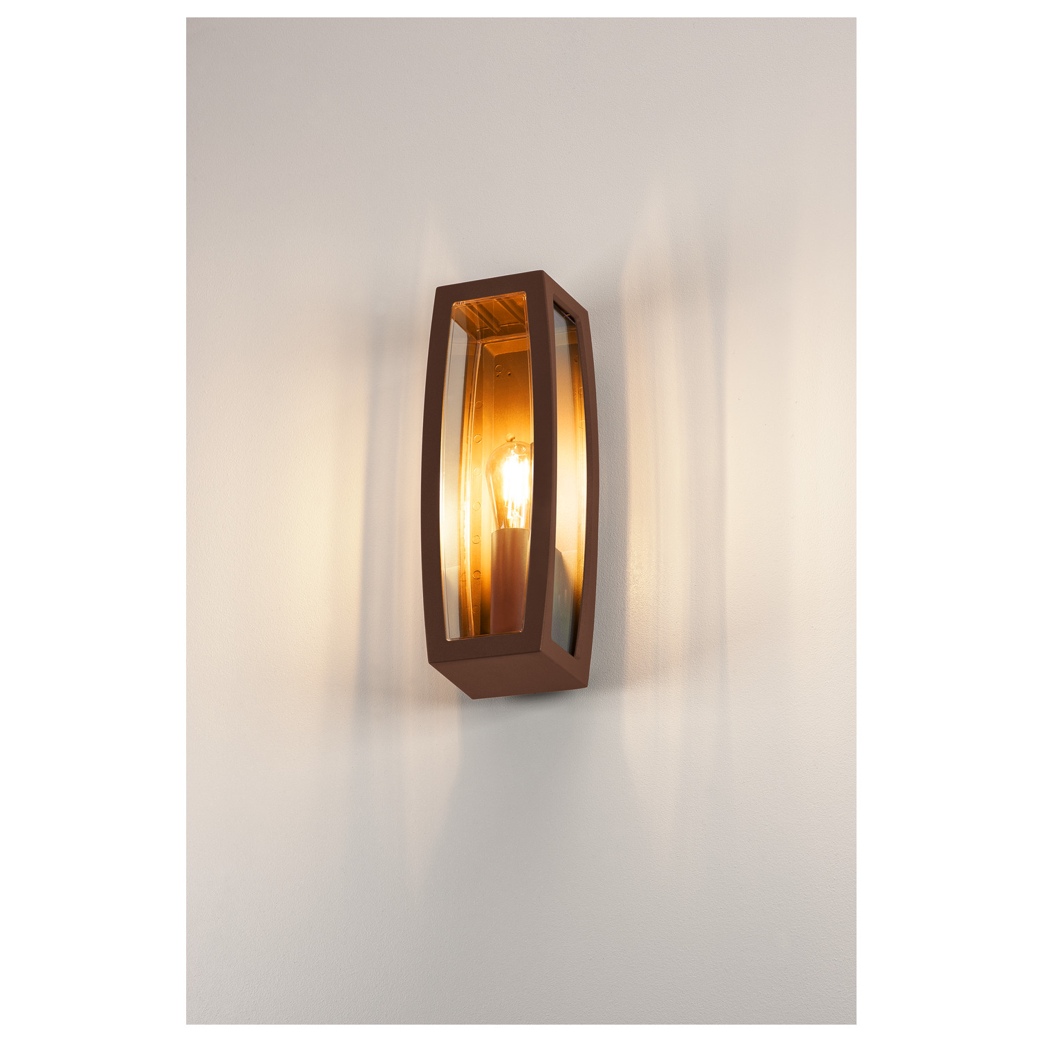 MERIDIAN BOX, Outdoor Wandleuchte, TC-(D,H,T,Q)SE, rost, max. 25 W, klarer Kunststoff